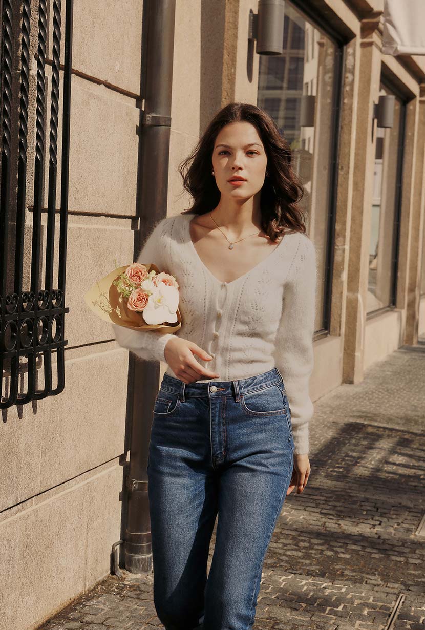 - Buttery-soft, fuzzy superfine kid mohair with delicate crochet detailing